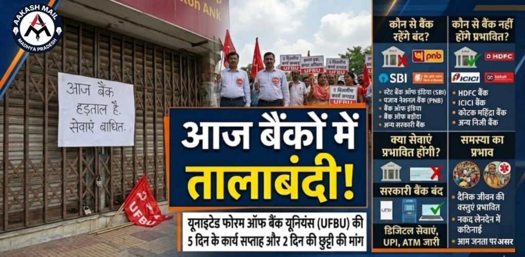 बैंक कर्मचारियों की हड़ताल के कारण मंगलवार को बैंकिंग सेवाएं प्रभावित होने की संभावना है। यूनाइटेड फोरम ऑफ बैंक यूनियंस (UFBU) ने 5 दिन के काम के सप्ताह और 2 दिन की छुट्टी की मांग को लेकर हड़ताल का आह्वान किया है। इस हड़ताल में देशभर के लगभग 40 हजार बैंक कर्मचारी शामिल होंगे, जिससे सरकारी बैंकों की सेवाएं ठप रहेंगी ।